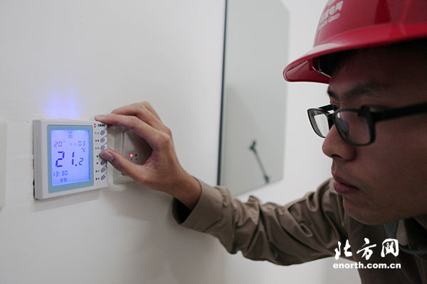 國網(wǎng)天津靜海公司員工在教室內(nèi)查看供暖系統(tǒng)運(yùn)行情況