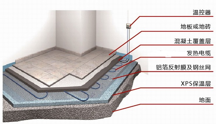 發(fā)熱電纜地面輻射供暖系統(tǒng)以發(fā)熱電纜為發(fā)熱體,通電發(fā)熱,以低溫輻射的方式溫暖整個房間。在實際安裝的時候,有兩種方式,濕式安裝和干式安裝。我們以安裝比較多的方式—濕式安裝方式為例。